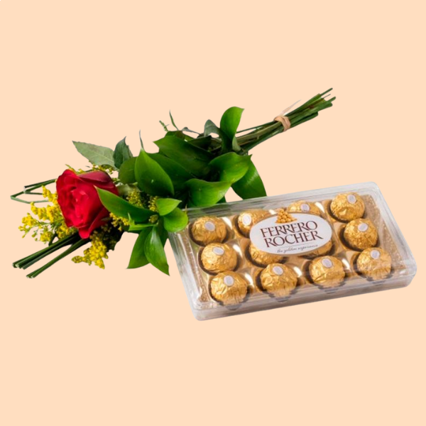 Ramalhete com uma rosa + Ferrero Rocher; um pequeno gesto que desperta grandes emoções.