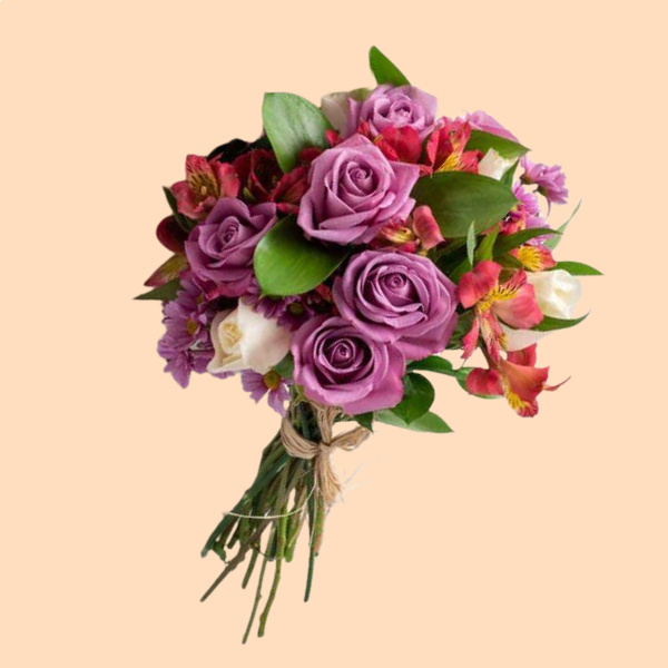 1 Ramalhete com seis rosas lilás e seis cor de rosa